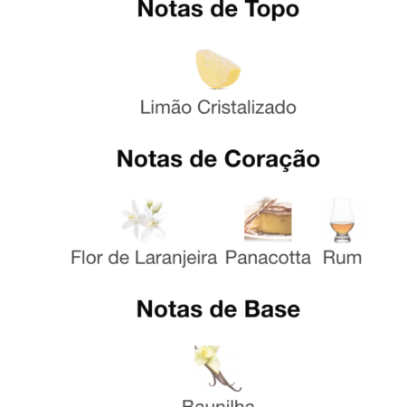 Logo na saída, o perfume surpreende com a doçura brilhante do limão cristalizado, criando uma abertura cítrica com um toque açucarado e moderno. No coração, a flor de laranjeira traz leveza e sofisticação, contrastando harmoniosamente com o lado cremoso da panacotta e o toque licoroso do rum, que adiciona profundidade e um ar provocante. A base se encerra com a presença marcante e delicadamente adocicada da baunilha, garantindo um rastro quente, elegante e acolhedor.