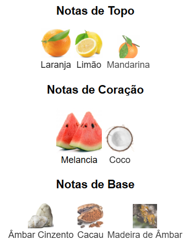 As notas de fundo são: Âmbar Cinzento, Cacau e Madeira de Âmbar.