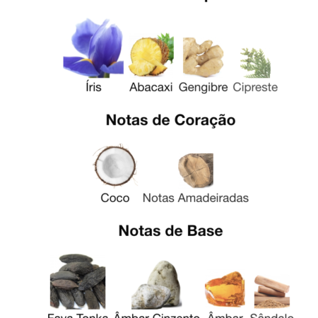 A abertura revela um contraste marcante entre o frescor do abacaxi, a elegância da íris, o toque quente do gengibre e a profundidade verde do cipreste. No coração, a cremosidade do coco é suavemente equilibrada com notas amadeiradas, criando uma base macia e luxuosa. Por fim, o fundo traz a assinatura oriental intensa com fava tonka, âmbar cinzento, âmbar tradicional e o calor do sândalo, resultando em uma fragrância rica, sedutora e duradoura.
