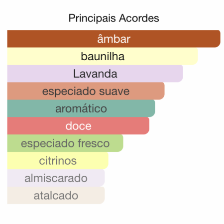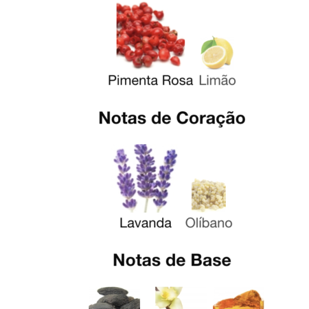 A abertura traz a vivacidade do limão em contraste com o toque picante da pimenta rosa, criando um início fresco, moderno e energético. No coração, a lavanda se destaca com seu lado aromático e elegante, enquanto o olíbano acrescenta um aspecto resinoso e levemente incensado, proporcionando profundidade à composição. Finalizando, a base é envolvente e confortável, com a doçura cremosa da baunilha, a intensidade da fava tonka e o calor do âmbar, formando um rastro sofisticado e duradouro.